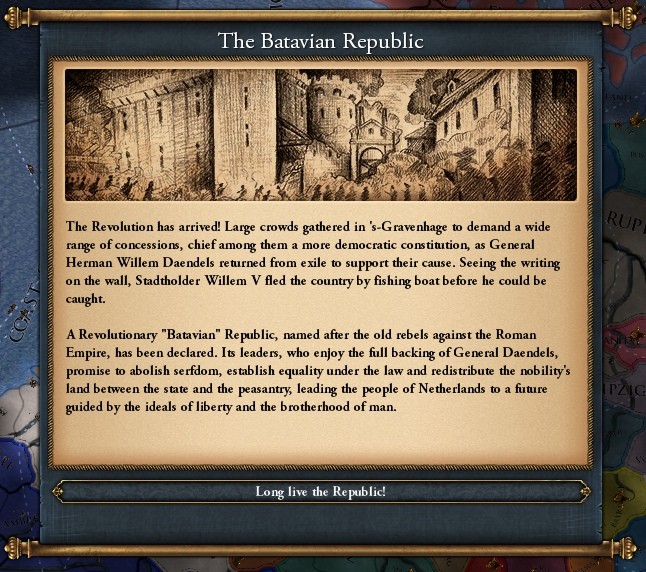 Когда вы становитесь революционной державой, вы получите текст, скорее всего, уникальный, описывающий, как именно ваш народ освободил себя. Caligula Caesar написал множество различных уникальных текстов для нескольких крупных стран по всему миру. Да, по всему миру, поскольку, хотя революция, скорее всего, и случится в Европе, мы не ограничиваем механики этим континентом.