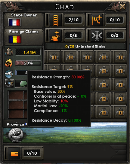 У сопротивления и покорности также будут разблокируемые эффекты. У сопротивления по достижению 25% прогресса возможность чаще обходить щит гарнизона . Достижение 25% покорности значит снижение требований по подавлению для текущего уровня сопротивления.