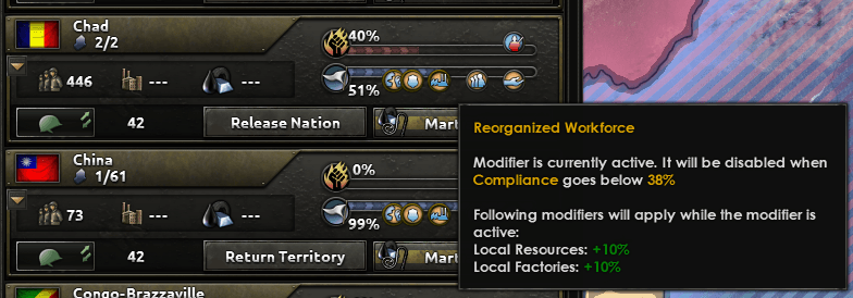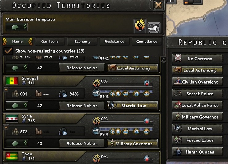 Вместе с этими новыми системами, мы переделали обращение с оккупированными регионами. Колониальные регионы были удалены в принципе и теперь любая территория под властью нации без щитков, будет считаться оккупированным. Оккупированные регионы станут менее полезны для захватчика. Доступ к фабрикам и ресурсам по умолчанию станет куда меньше. Однако завоеватель сможет выручить куда больше из региона, взращивая покорность и подкручивая закону оккупации. Это создаст зримую разницу между национальными территориями и колониями.