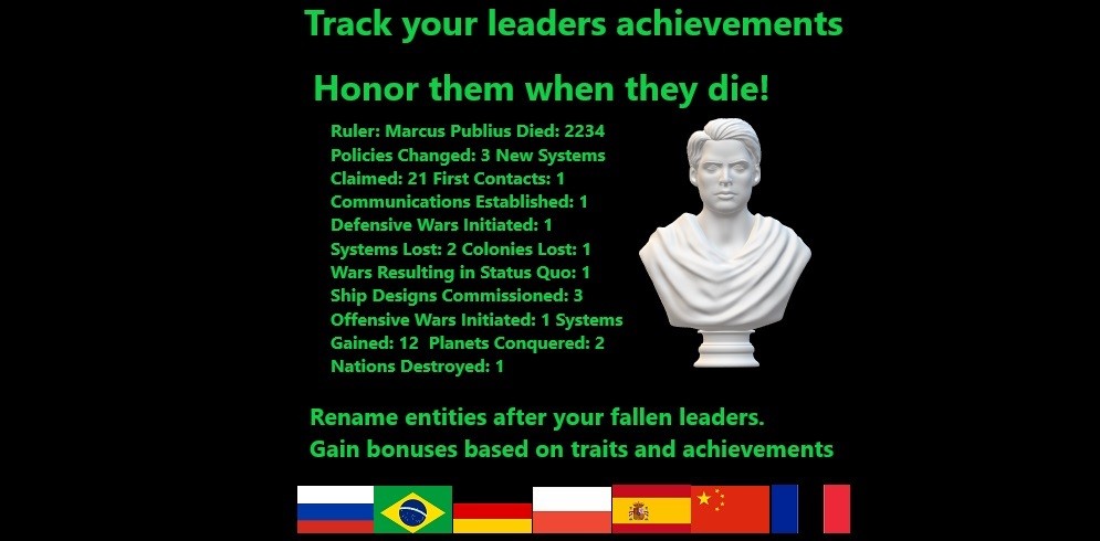 Данный мод меняет механику лидерства, делая ее более значимой. Вы никогда не задумывались, чего ваши высокопоставленные подчиненные добились во время пребывания в должности? Вы получаете уведомление о смерти одного из лидеров и даже не вспомните кто это был, возможно это ваш Великий Адмирал, Великий Исследователь или ученый?