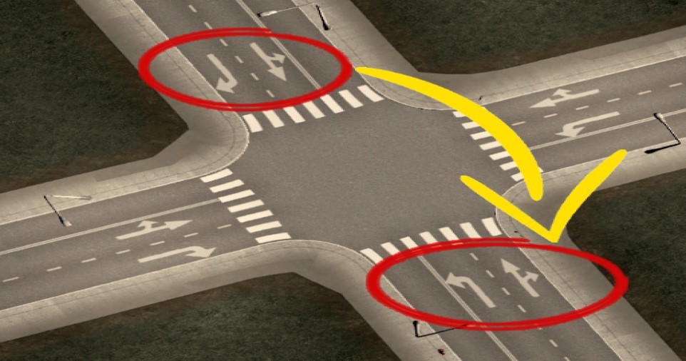 Мод переопределяет правила соединения полос движения по умолчанию для всех дорожных развязок. Он способствует созданию выделенных поворотных полос и более сбалансированному распределению соединений полос движения в каждом направлении, что способствует лучшему использованию полос движения транспортными средствами. Есть две ситуации, в частности, когда он работает лучше, чем поведение игры по умолчанию: