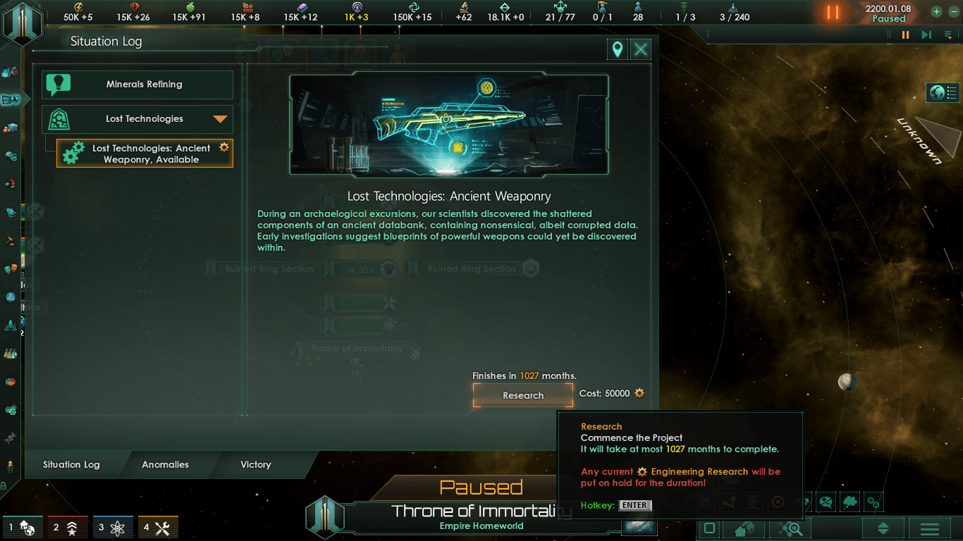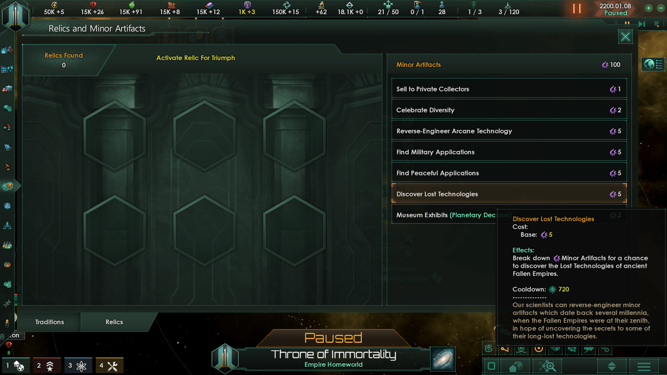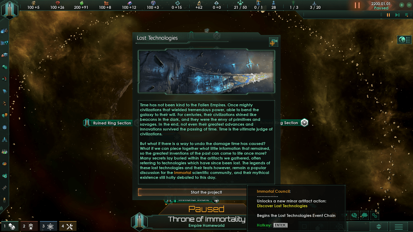 Мод Zenith of Fallen Empires: Secrets of the Fallen Empires/ Рассвет угасших империй: секреты угасших империй расширяется за счет механики Lost Technologies, представленной в «Автоматизированных отраслях», путем введения в игру около 20 новых Lost Technologies (потерянные технологии), которые игрок может раскрыть, включая новые компоненты оружия / корабля, класс корабля Голиаф и оригинальные эскорты, линейные крейсеры и секции титанов угасших империй.